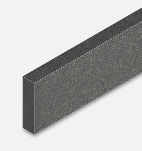 Obere Längskante, eine breite Stellfläche und beide Köpf in Keramik, auf Gehrung gesägt und frostfest verklebt. Restliche Seiten offen mit sichtbarem Betonkern. Gehrungskante mit Fase,