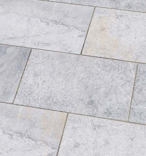 Herkunft: China, allseits geflammt & gebürstet, Längskanten 7mm/45°, sonst 4mm/45° gefast, silbergrau-liniert